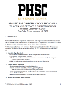 Approved by the Florida Department of Education to be higher education institution authorizer, Pasco Hernando State College (“PHSC”)  releases this, the college’s first, request for proposals to operate a charter school authorized by the PHSC Board of Trustees.