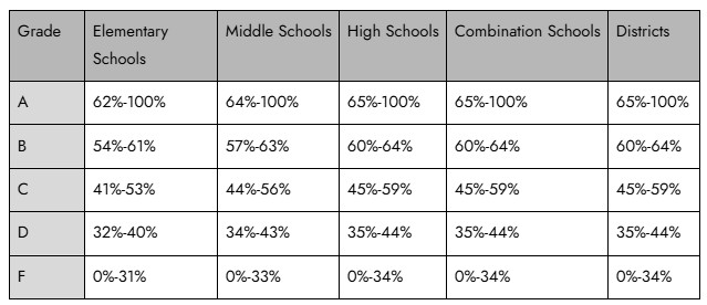 For the 2024-25 school grades, 82% of high schools and 77% of combination schools achieved an “A” or “B”. Consequently, the grading scales for these school types, as well as for districts, will be adjusted for the upcoming 2025-26 school year. Under state rule, high schools, combination schools, and districts must now earn 65% or more of possible points to be awarded an “A” grade. This represents an increase in the minimum points required for an “A” in these school types.