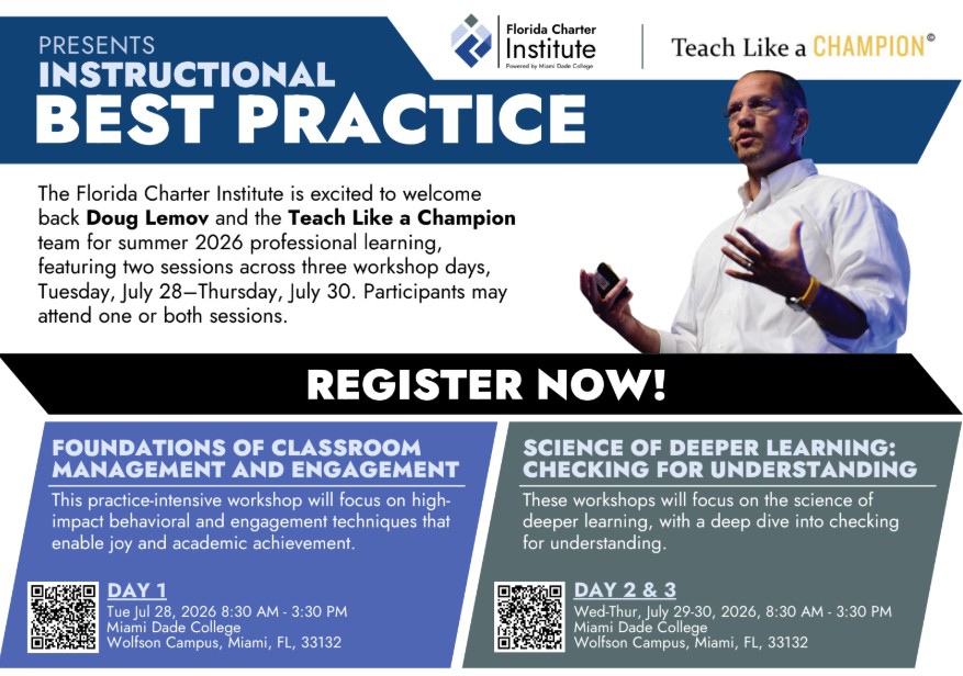 The Florida Charter Institute is excited to welcome back Doug Lemov and the Teach Like a Champion team for professional learning in summer 2026. Teach Like a Champion will offer two sessions across three workshop days running from Tuesday, July 28-Thursday, July 30. Participants can attend one or both sessions.